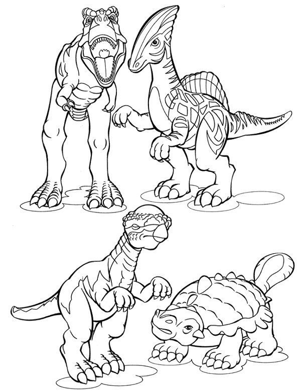 Śmieszna kolorowanka dla dzieci do pobrania i druku za darmo. Pokoloruj cztery różne dinozaury. Czy wiesz jak się nazywają?