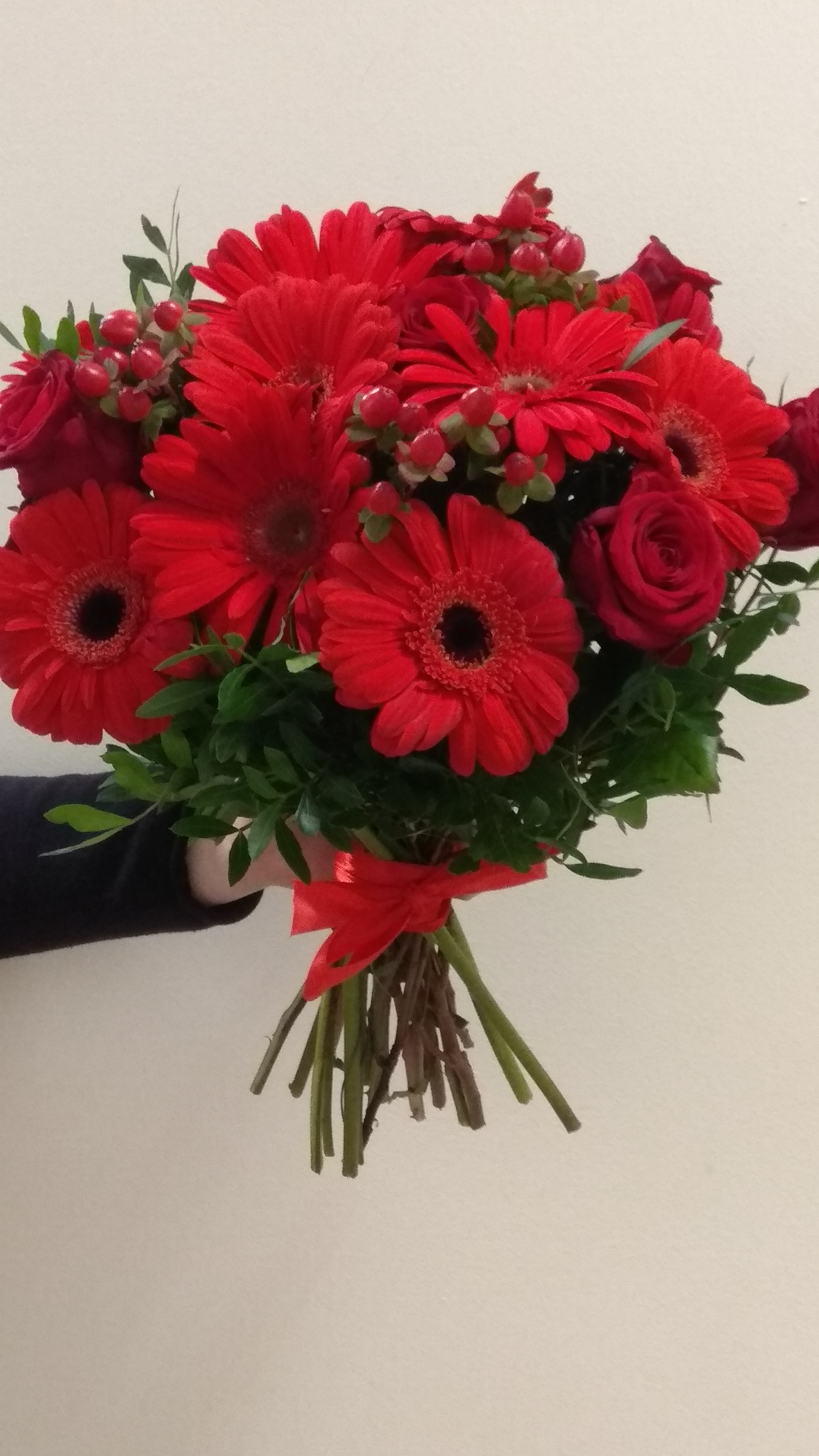 Mężczyzna ukrywa się za ścianą i wyciąga rękę z bukietem czerwonych gerberów dla nas.