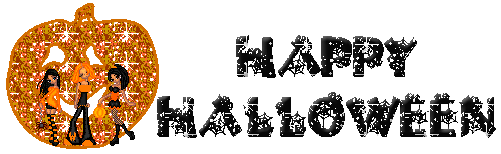 Brokatowy animowany gif przedstawiający trzy laleczki stojące w dyni i czarny napis szczęśliwego Halloween.