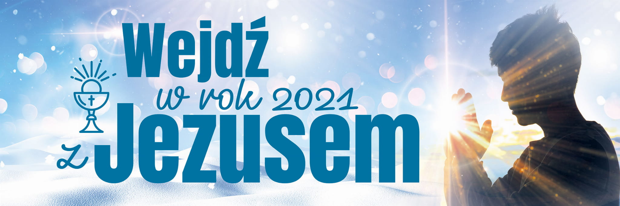 Baner z niebieskim napisem wejdź w rok 2021 z Jezusem.