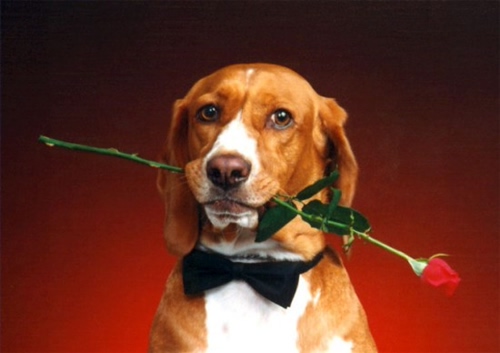 Obrazek z psem beagle z lecącymi serduszkami na Walentynki.