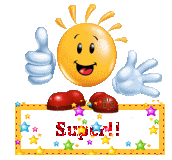 Uśmiechnięta emotikonka słoneczko w czerwonych butach trzyma kciuk w górę i stoi na ruszającej się ramce z napisem super.