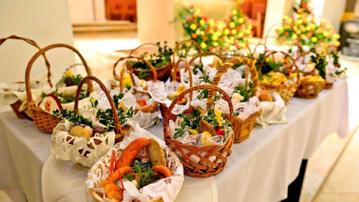 Mnóstwo koszyków wielkanocnych z kiełbaską, chlebem, solą, jajkami ułożone na kościelnym stole. Wielka Sobota.