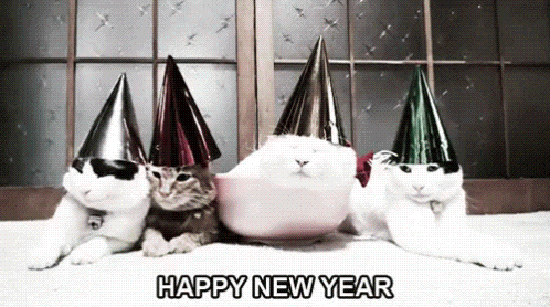 Animowany gif przedstawiający cztery koty z czapkami na głowach, którzy wspólnie obchodzą zabawę sylwestrową w swoim kocim gronie.