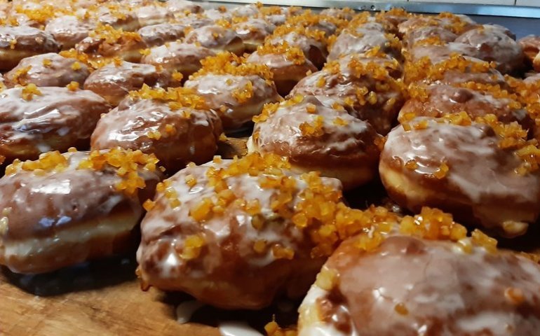 Mnóstwo pysznych pączków z lukrem i pomarańczą przygotowane w piekarni na tłusty czwartek. Smacznego.