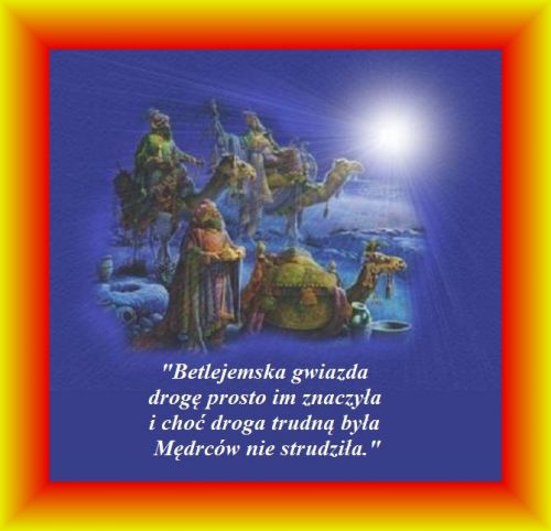 Niebieska piękna kartka. "Betlejemska gwiazda drogę prosto im znaczyła i choć droga trudną była Mędrców nie strudziła". 6 stycznia Trzech Króli.