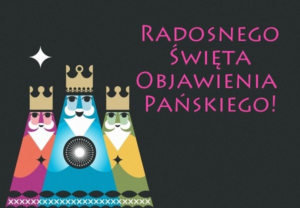 Czarna kartka z trzema królami i różowym napisem radosnego święta objawienia Pańskiego.