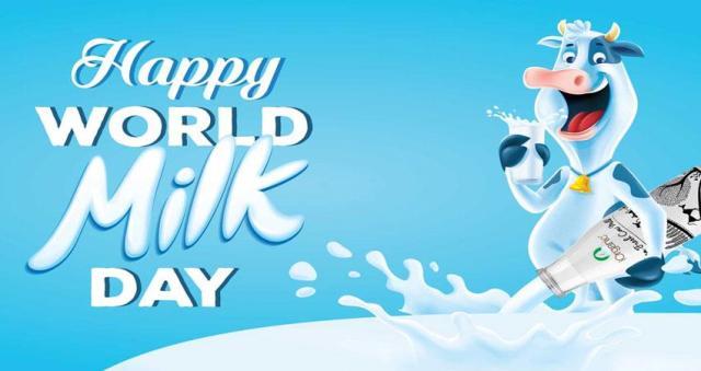 Pomarańczowy duży baner z białym napisem światowy dzień mleka. Szklanka z...