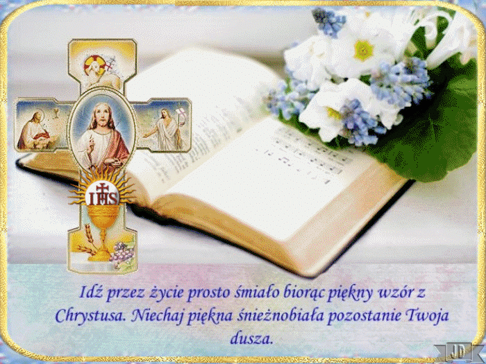 Obrazek z ciałem i krwią Pana Jezusa i życzenia w dniu Pierwszej Komunii...