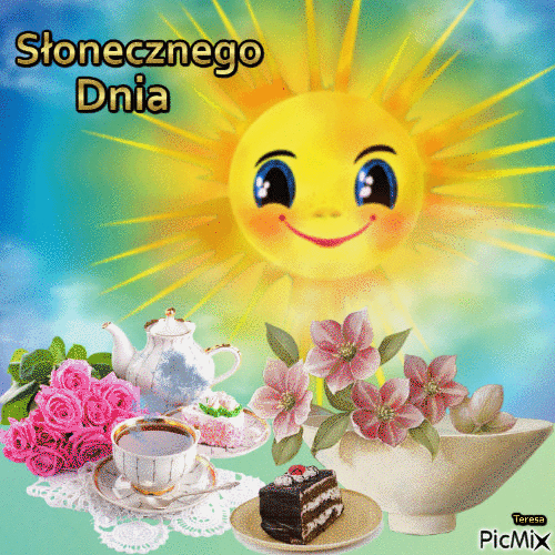 Animowany obrazek ze słonecznikami i życzenia: Słonecznego dnia....