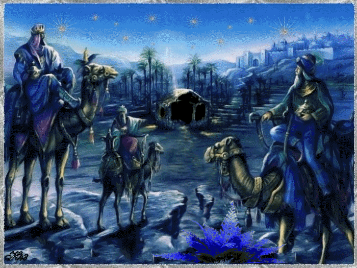 Niebieska kartka z błyszczącymi Trzema Królami, którzy patrzą...