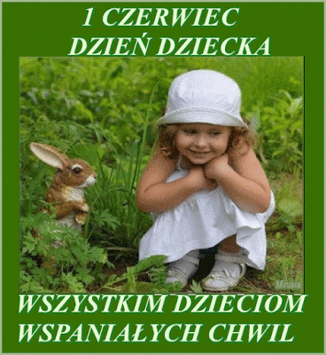 Obrazek z dziewczynką z kwiatami, z napisem 1 czerwca Dzień Dziecka,...