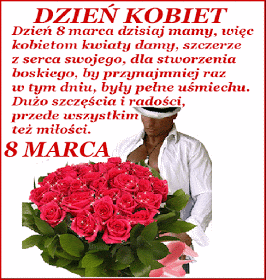 Kartka: Mężczyzna z bukietem błyszczących róż i życzeniami z okazji dnia kobiet