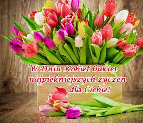 Kartka: Mnóstwo tulipanów w skrzynce z życzeniami na 8 marca
