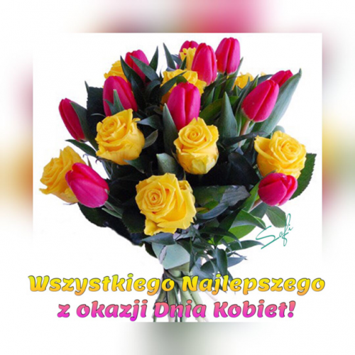 Kartka: Żółte róże i różowe tulipany z życzeniami na dzień kobiet