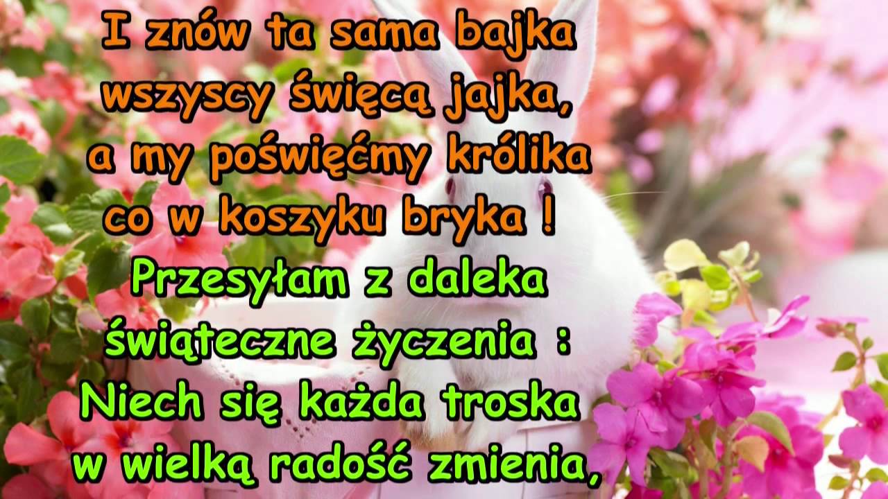 Biały króliczek wśród kwiatów i piękne życzenia "I znów ta sama bajka, wszyscy święcą jajka, a my poświęćmy królika co w koszyku bryka. Przesyłam z daleka świąteczne życzenia: Niech się każda troska w wielką radość zmienia".